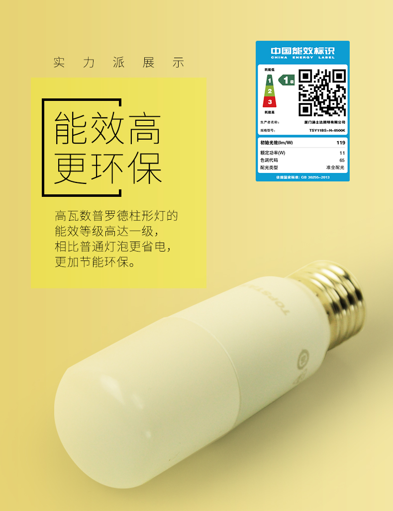 高瓦數(shù)普羅德柱形燈的能效等級(jí)高達(dá)一級(jí),相比普通燈泡更省電,更加節(jié)能環(huán)保。